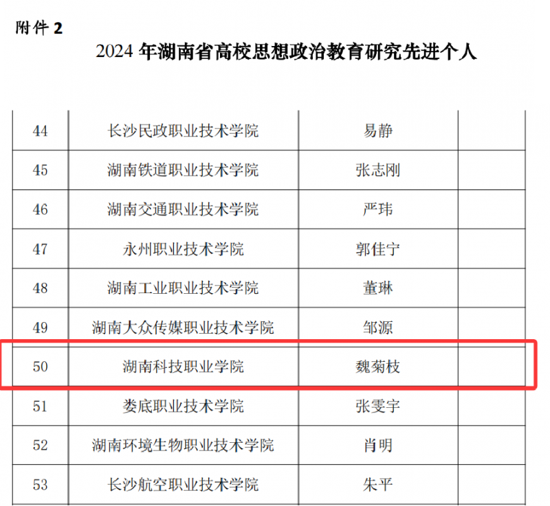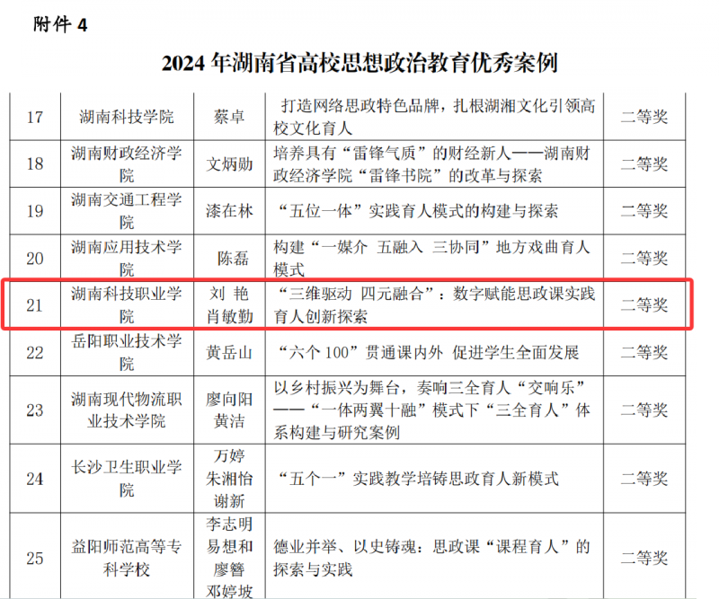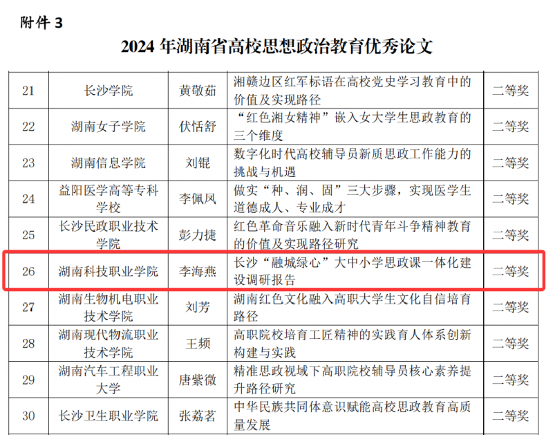 经省内各本科和高职院校自行申报、研究会各分支机构推荐、专家组评审,共评选出“先进个人”92人,优秀论文60篇(二等奖20篇,其中高职院校7篇),优秀案例50个(二等奖15个,其中高职院校5个)。其中,魏菊枝老师荣获“2024 年湖南省高校思想政治教育研究先进个人”,李海燕老师的《长沙“融城绿心”大中小学思政课一体化建设调研报告》荣获优秀论文二等奖,刘艳老师、肖敏勤老师的《“三维驱动 四元融合”:数字赋能思政课实践育人创新探索》荣获优秀案例二等奖。
